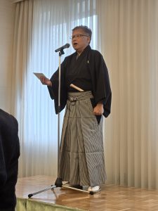 まずは「詩吟のひととき」。同窓会のお祝いの席にふさわしい詩吟を、中島秀人(37回生)さんこと、中島旗州さんにご披露いただきました。第17号の同窓会だよりにも全国大会出場についてご寄稿いただき、また今年の長崎くんちでは新大工町の吟士を務められました。素晴らしいお声をお聞かせいただきました。
