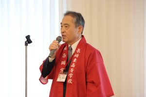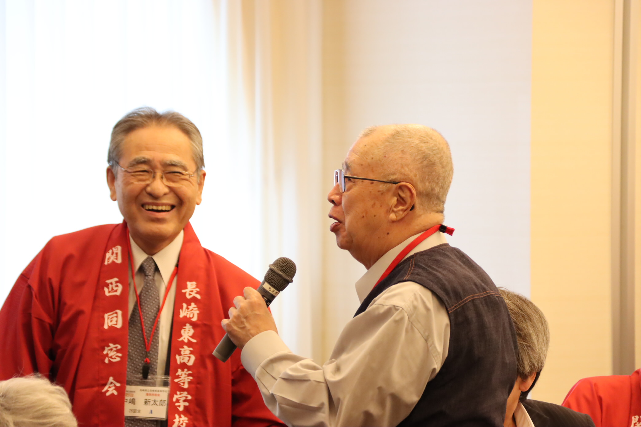 続いて、母校からご出席いただいた田川耕太郎校長先生、長崎東高同窓会からご出席いただいた塚﨑寛会長(25回生)をご紹介いたしました。田川校長先生からは、母校の現状や生徒たちの活躍、特に西山から立山への校舎移転から50年を迎えることなどについてお話しいただきました。塚﨑会長からは、一般社団法人としての活動状況などをご紹介いただきました。