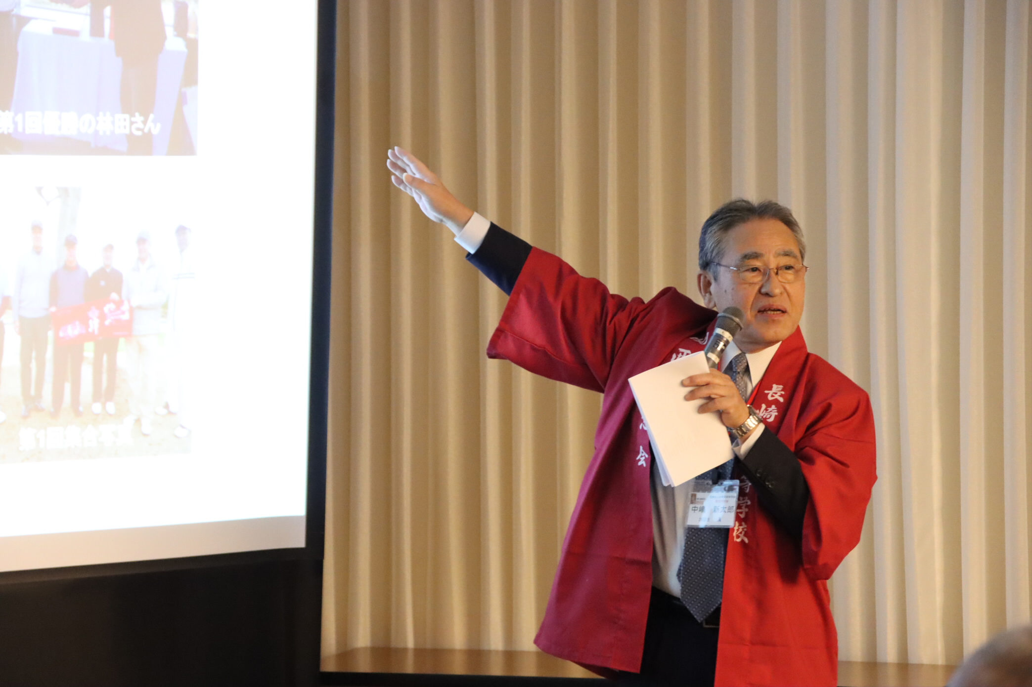 次に、同好会活動紹介の時間です。関西さるく会会長の大久保勝之さん(37回生)からは、これまでの歩みや2026年に第100回を迎えること、三田村さん(10回生)からの反省会開始のエピソードをご紹介いただきました。続いて、ゴルフ同好会会長の中嶋新太郎さん(26回生)からも、これまでの歩みや参加者募集についてお話しいただきました。