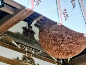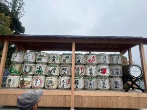 ご神体なので拝殿を通して参拝です。さらに中を覗くと直径1.5m、重さ200㌔もの大きな杉玉(酒林)が!11月14日の神事の後、ここから全国に杉玉が届けられるとのことです。