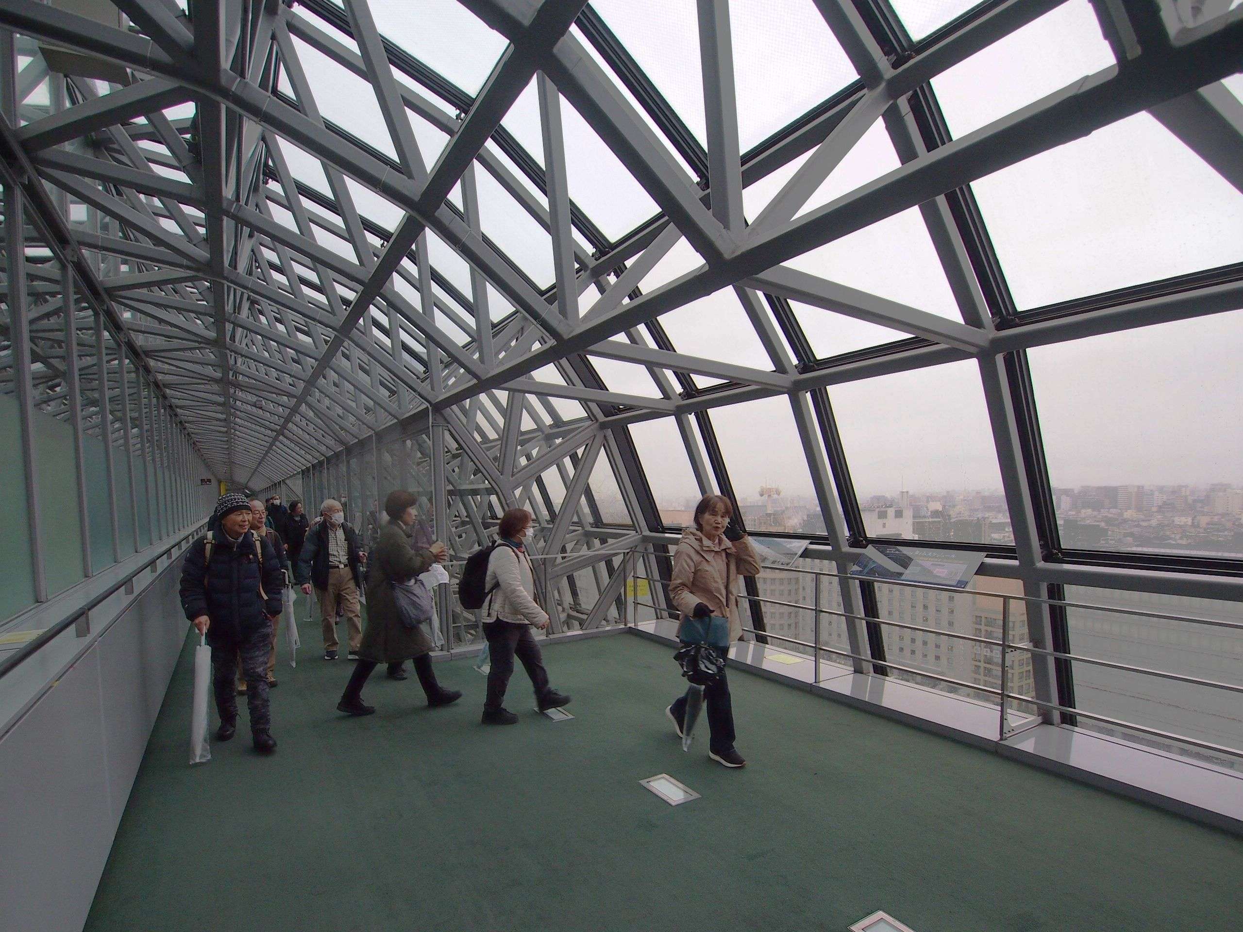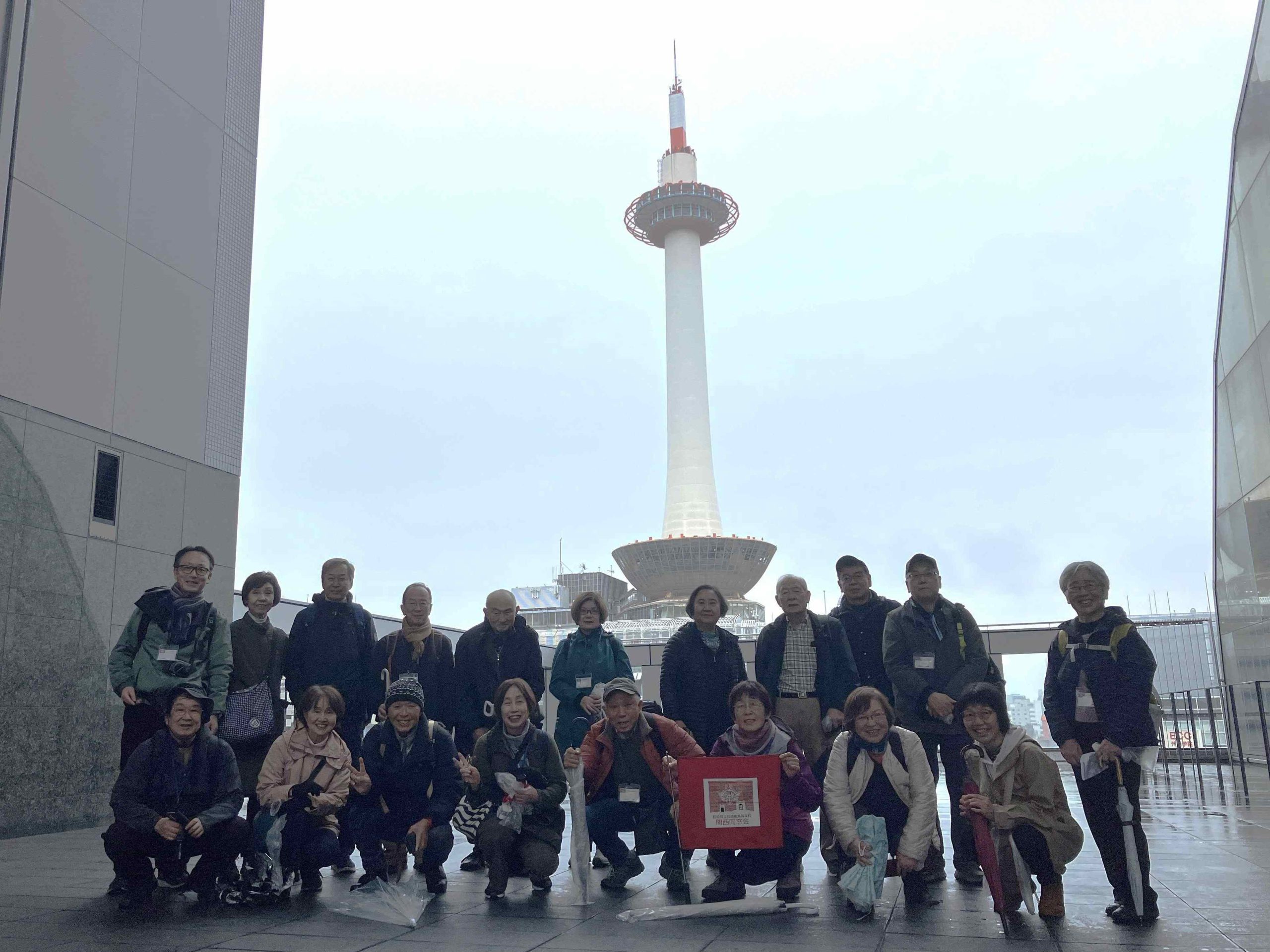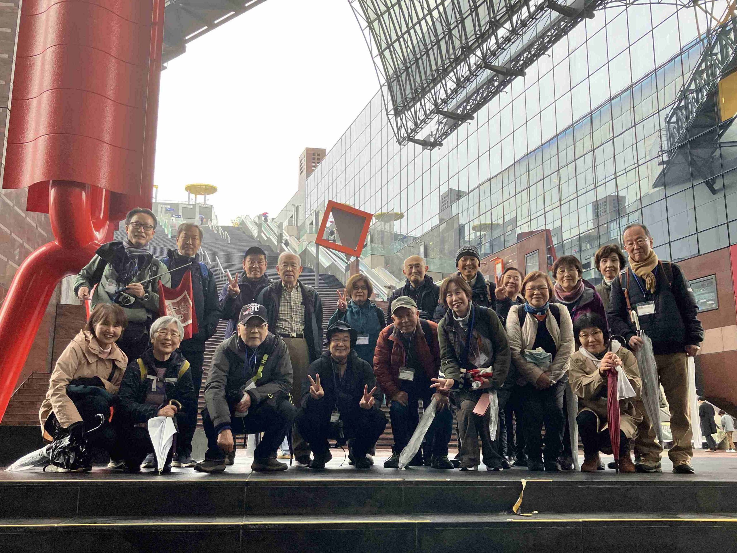 京都駅1階・中央改札口に集合した後は、大階段沿いのエスカレーターで一気に屋上へ。そこから少し戻って駅ビル内に入り、空中経路を通り抜けました。1階の喧騒が嘘のように静かで人通り少なく、京都タワーや東西本願寺を望む“空中さるく”はとても快適。参加者の皆さんも初めての体験だったようで、ご好評をいただきました。